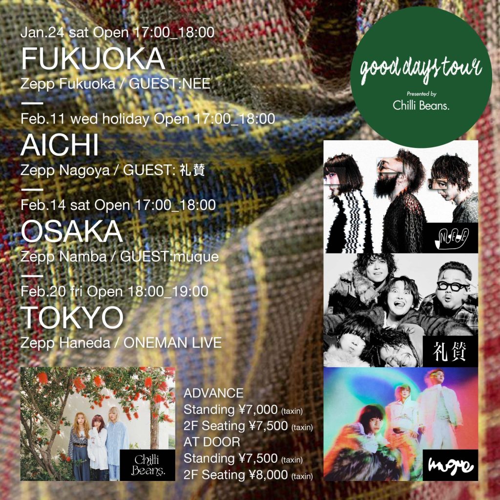 『Chilli Beans. "good days tour"』<大阪公演> 2026/2/14(土) @Zepp Namba 開場17:00 / 開演18:00 【出演】 Chilli Beans. / muque 【チケット】 <1Fスタンディング> ・前売:¥7,000(税込) <2F指定席> ・前売:¥7,500(税込) ※1申し込み4枚まで ※未就学児入場不可 ※入場時別途ドリンク代必要 イープラス: https://eplus.jp/chillibeans/ ローソンチケット: https://l-tike.com/chilli-beans/ チケットぴあ: https://w.pia.jp/t/chilli-beans/ 【公演に関するお問い合わせ】 キョードーインフォメーション 0570-200-800
