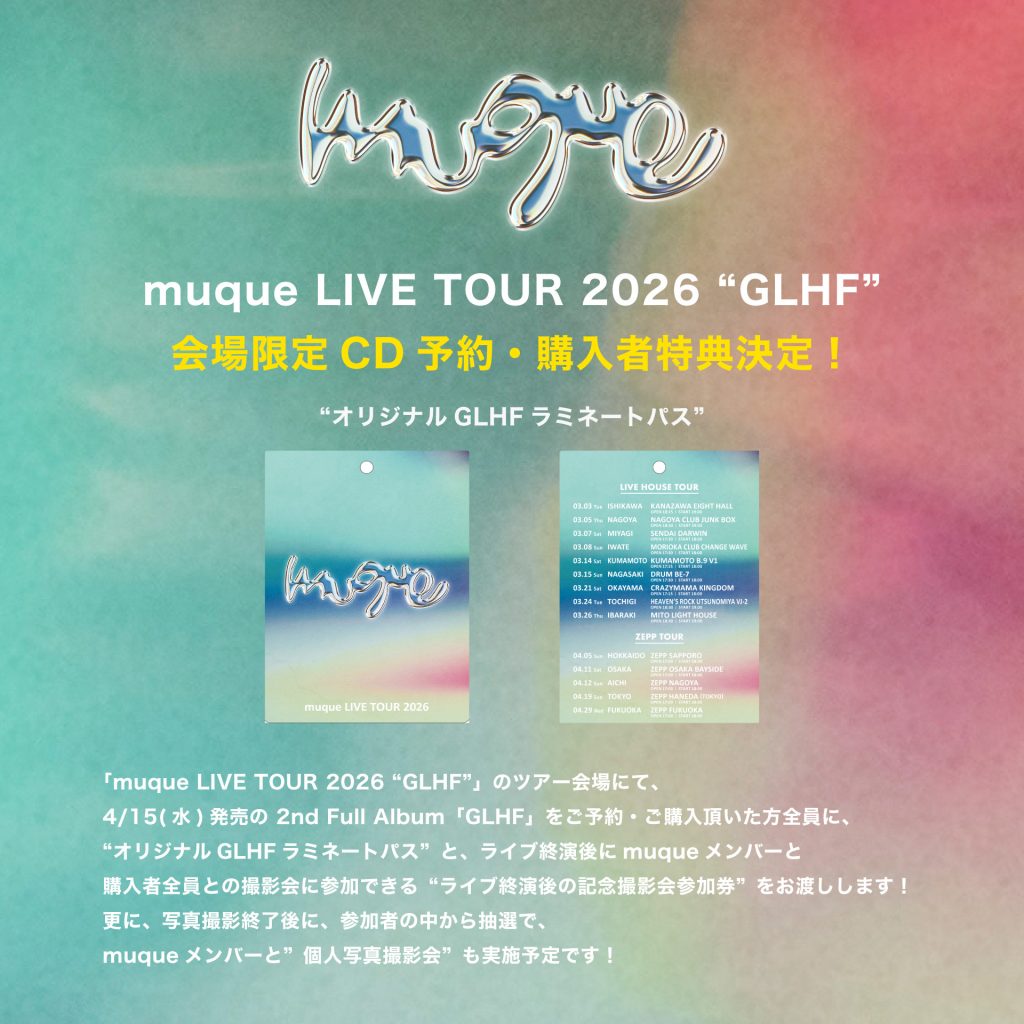 【会場限定CD予約・購入者特典決定!】「muque LIVE TOUR 2026 "GLHF"」のツアー会場にて、4月15日発売 2nd Full Album「GLHF」をご予約・ご購入いただいた方もれなく全員に、【オリジナルGLHFラミネートパス】と、ライブ終演直後のmuqueメンバーと購入者全員との撮影会に参加できる【ライブ終演後の記念撮影会参加券】をお渡しいたします! さらに!写真撮影終了後には参加者の中から抽選で、muqueメンバーと"個人写真撮影会"も実施予定です。 ツアー会場だけの特別な企画!全国のライブ会場でみなさまのご参加をお待ちしております! 詳細はこちら! 【muque OFFICIAL FANCLUB「team qrog」新規入会キャンペーン・既存会員特典配布決定!】