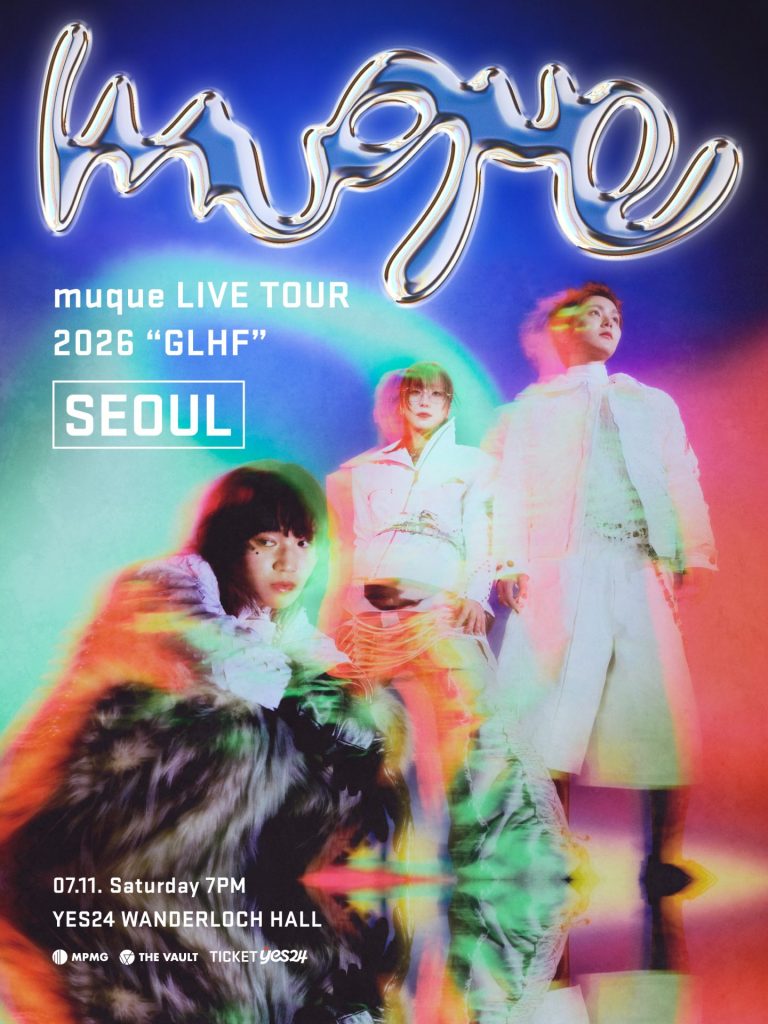 『muque LIVE TOUR 2026 "GLHF" in Seoul』 7/11(Sat), 7:00 PM at YES24 WANDERLOCH HALL 【Ticket Info】 ・1층 스탠딩 : 99,000원 ・2층 지정좌석 : 99,000원 * 1인 2매까지 구매하실 수 있습니다. • 1F Standing: 99,000 KRW • 2F Reserved Seating: 99,000 KRW Limit: up to 2 tickets per person. ・1階スタンディング:99,000ウォン ・2階指定席:99,000ウォン ※お一人様2枚までご購入いただけます。 韓国国内向け:https://ticket.yes24.com/Perf/57606 GLOBAL:https://ticket.yes24.com/Pages/English/Perf/FnPerfDeail.aspx?IdPerf=57606 3월 27일(금) 오후 7시 예매 오픈 On sale from Friday, March 27 at 7:00 PM 3/27(金)19:00発売開始