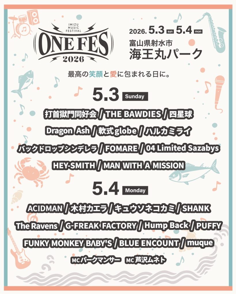 『ONE FES 2026 -IMIZU MUSIC FESTIVAL』 5/4(月) @海王丸パーク 開場10:00 / 開演11:00 (予定) 【チケット】 https://one-fes.jp/ticket/ 【公演詳細】 https://one-fes.jp/ 【公演に関するお問い合わせ】 info@one-fes.jp