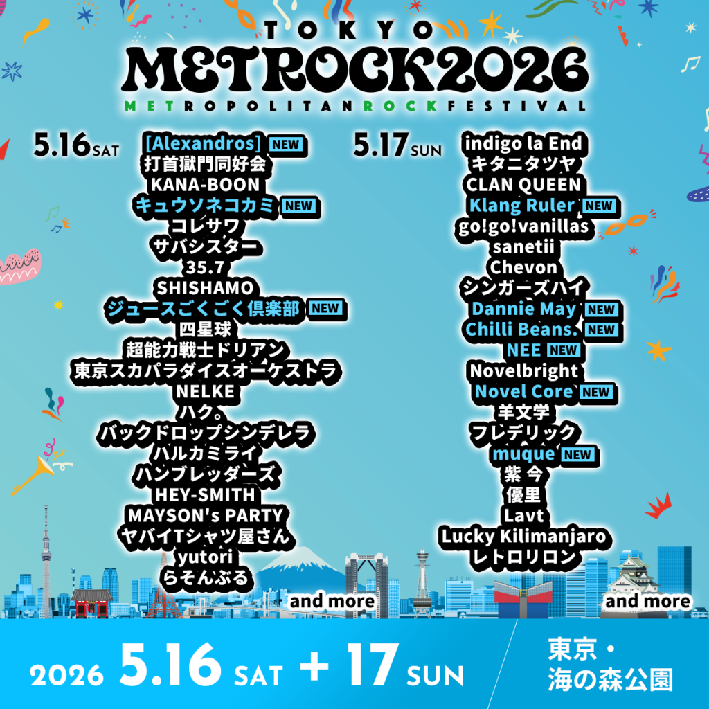 『TOKYO METROPOLITAN ROCK FESTIVAL 2026』 5/17(日) @海の森公園 開場8:30 / 開演10:30(予定) 【チケット】 https://metrock.jp/ticket/index.html 【公演詳細】 https://metrock.jp/ 【公演に関するお問い合わせ】 DISK GARAGE https://info.diskgarage.com/