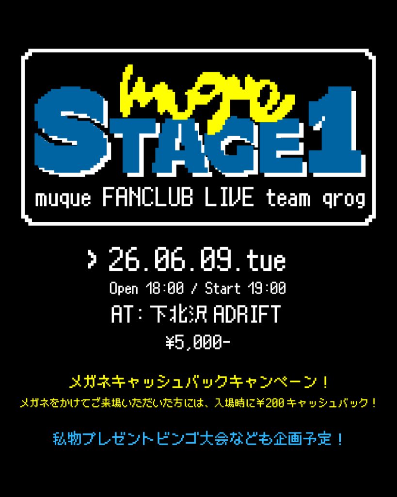 初のFCライブ開催決定! 『muque FANCLUB LIVE team qrog - STAGE1 -』 6/9(火) @下北沢ADRIFT 開場18:00 / 開演19:00 【出演】 muque 【チケット】 ・オールスタンディング:¥5,000(税込) ※別途ドリンク代必要 ※未就学児入場不可 ※お一人様1枚まで チケット販売の詳細は後日お知らせいたします! ファンクラブご入会はこちら https://muque-fc.com/join 🥸メガネキャッシュバックキャンペーン🥸 メガネをかけてご来場いただいた方には、入場時に¥200キャッシュバック! -キャッシュバックの対象について ・サングラスも対象となります。 ・入場時に着用していればキャッシュバックの対象です。観覧中に外していただいても問題ありません。 -ご注意 下記に該当するメガネの着用はご遠慮ください。 ・他のお客様の視界を妨げる恐れのあるもの ・発光するメガネなど、演出の妨げになるもの ・ご自身や他のお客様の怪我につながる可能性のあるもの 【イベントに関するお問い合わせ】 下記ページの最下部「お問い合わせフォーム」にて「サイトの不具合について」をご選択の上、送信ください。 https://muque-fc.com/support 平日 11:00~17:00 ※土・日・祝祭日・年末年始はお休みをいただいています。ご了承ください。