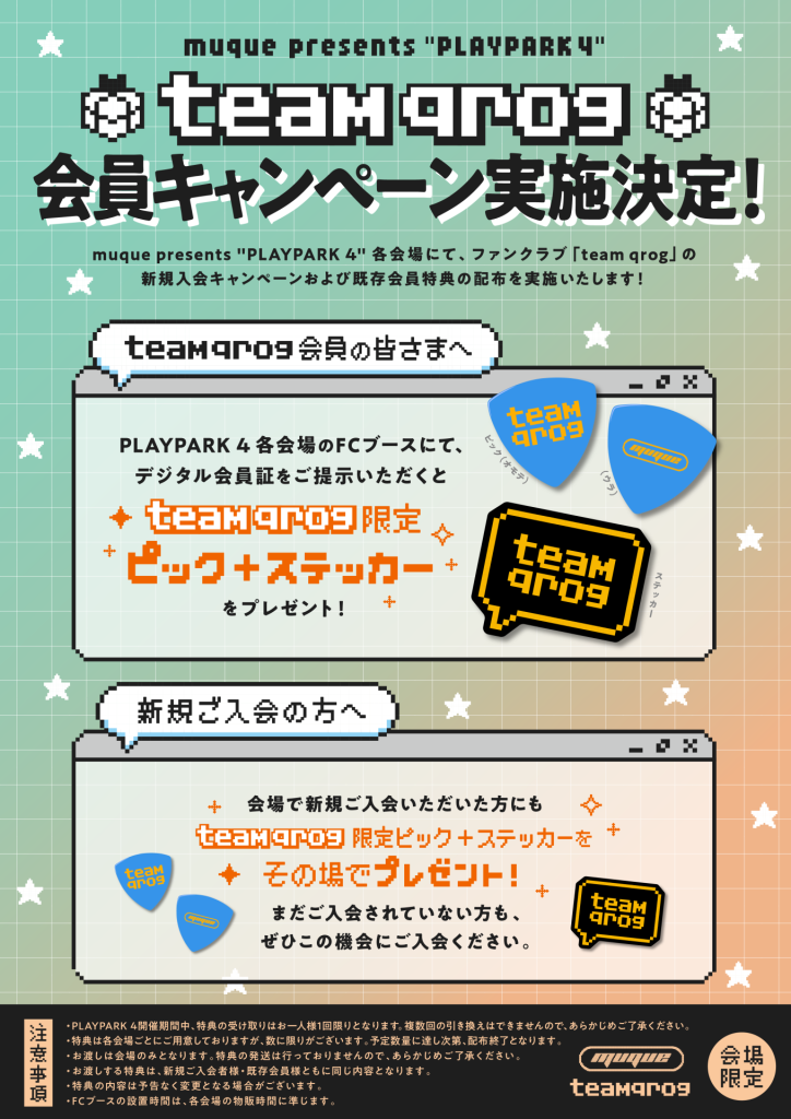 「muque presents "PLAYPARK 4"」各会場にて、 muque OFFICIAL FANCLUB「team qrog」の新規入会キャンペーンおよび既存会員特典の配布が決定! 【特典内容】 ■ 既存会員のみなさまへ 「muque presents "PLAYPARK 4"」各会場のFCブースにて、デジタル会員証をご提示いただくと team qrog限定【ピック】+【ステッカー】をプレゼント! ■ 新規ご入会の方へ 会場で新規ご入会いただいた方にも team qrog限定【ピック】+【ステッカー】をその場でプレゼント! まだご入会されていない方も、ぜひこの機会にご入会ください! 【注意事項】 ・「PLAYPARK 4」開催期間中、特典の受け取りはお一人様1回限りとなります。複数回の引き換えはできませんので、あらかじめご了承ください。 ・特典の受け取りは有料会員のみ対象となります。 ・特典は各会場ごとにご用意しておりますが、数に限りがございます。予定数量に達し次第、配布終了となります。 ・お渡しは会場のみとなります。特典の発送は行っておりませんので、あらかじめご了承ください。 ・お渡しする特典は、新規ご入会者様・既存会員様ともに同じ内容となります。 ・特典の内容は予告なく変更となる場合がございます。 ・FCブースの設置時間は、各会場の物販時間に準じます。