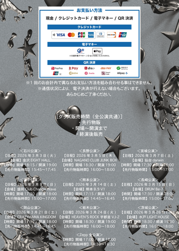 --------------------- 【注意事項】 ※開場・開演時間は変更になる可能性がございます。予めご了承ください。 ※入場券 1枚につき 1名様のみご入場できます。 ※主催都合以外でのチケットの払い戻しは致しません。 ※チケットの営利目的の購入申し込み、及び転売行為は一切禁止です。転売されたチケットは無効となりご入場出来ません。 ※電⼦チケットをご購⼊のお客様は、ご来場の際は必ず電⼦チケットが提⽰できるスマートフォンをお持ちください。 ※スマートフォンやチケットの破損、紛失や充電切れなどでチケットが確認できない場合はご入場いただけませんのでご注意ください。 ※会場内では係員及び警備員の指示に従っていただくようお願い致します。もし指示に従っていただけないような場合にはご退場いただくこともありますので、ご了承ください。 ※コンサート本番中の撮影は画像、動画に関わらず一切禁止となります。もし撮影が発覚した場合は、その場でスタッフが画像、動画データを削除させていただきます。 ※会場内でのモッシュ、ダイブ等の危険⾏為、また、お客様同⼠で押し合ったり、ご⾃⾝の座席以外の使⽤等、他のお客様のご迷惑になるような⾏為は⼀切禁⽌となります。 係員の指⽰及び注意に従わずに⽣じた事故やトラブルについて、主催者、出演者、関係各所は⼀切の責任を負いかねます。 ※会場周辺でのアーティストの入り待ち・出待ち行為はお止めください。 ※発熱・体調がすぐれない場合のご来場はお控えください。