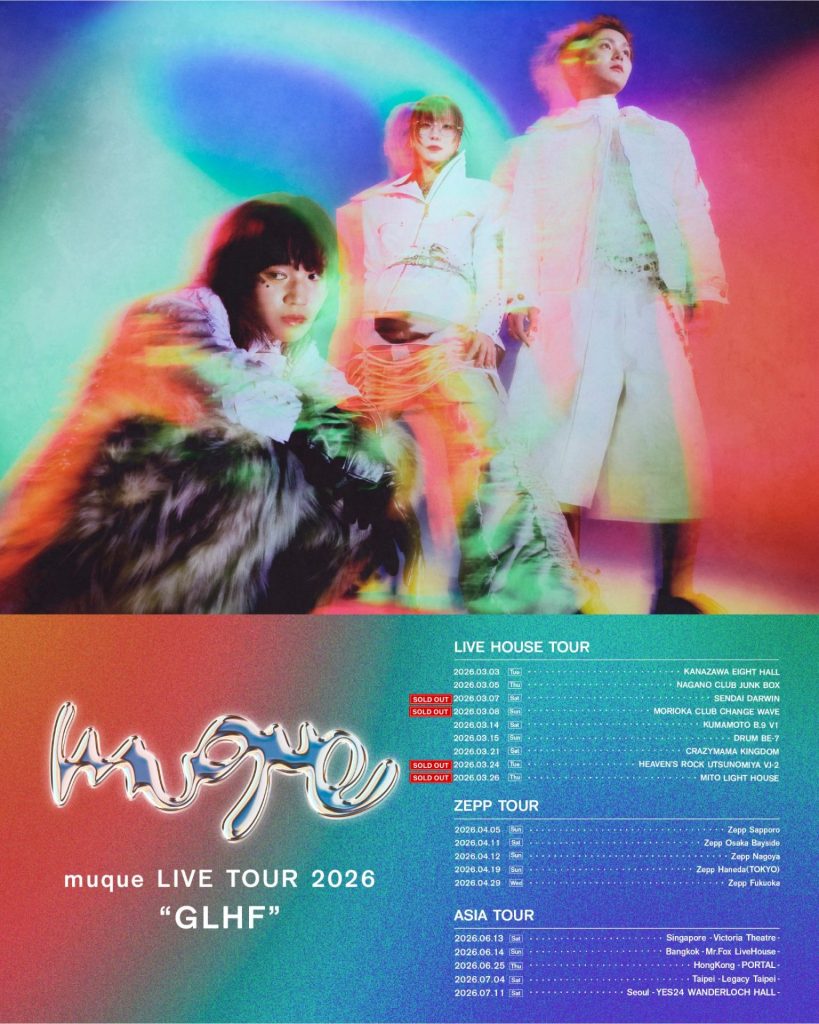 2026年3月よりZepp含む全国14都市&アジア5都市を周る「muque LIVE TOUR 2026 "GLHF"」開催決定! 各プレイガイドにてチケット先着販売中! 【muque LIVE TOUR 2026 "GLHF"】 <石川公演> 【日程】2026年3月3日(火) 【会場】金沢EIGHT HALL 【時間】開場18:15 / 開演19:00 【先行物販時間】15:45〜17:45 【info】FOB金沢 076-232-2424(平日11:00〜17:00) <長野公演> 【日程】2026年3月5日(木) 【会場】NAGANO CLUB JUNK BOX 【時間】開場18:30 / 開演19:00 【先行物販時間】16:00〜18:00 【info】FOB新潟 025-229-5000(平日11:00〜17:00) <宮城公演> ※Thank you SOLDOUT!! 【日程】2026年3月7日(土) 【会場】仙台darwin 【時間】開場17:30 / 開演18:00 【先行物販時間】15:00〜17:00 【info】(株)GIP https://www.gip-web.co.jp/t/info <岩手公演> ※Thank you SOLDOUT!! 【日程】2026年3月8日(日) 【会場】盛岡 Club Change Wave 【時間】開場17:30 / 開演18:00 【先行物販時間】15:00〜17:00 【info】(株)GIP https://www.gip-web.co.jp/t/info <熊本公演> 【日程】2026年3月14日(土) 【会場】熊本B.9 V1 【時間】開場17:15 / 開演18:00 【先行物販時間】14:45〜16:45 【info】株式会社 キョードー西日本 0570-09-2424 11:00〜15:00(日曜日/祝日休) <長崎公演> 【日程】2026年3月15日(日) 【会場】DRUM Be-7 【時間】開場17:30 / 開演18:00 【先行物販時間】15:00〜17:00 【info】株式会社 キョードー西日本 0570-09-2424 11:00〜15:00(日曜日/祝日休) <岡山公演> 【日程】2026年3月21日(土) 【会場】CRAZYMAMA KINGDOM 【時間】開場17:15 / 開演18:00 【先行物販時間】14:45〜16:45 【info】YUMEBANCHI(岡山) 086-231-3531(平日12:00〜17:00) <栃木公演> ※Thank you SOLDOUT!! 【日程】2026年3月24日(火) 【会場】HEAVEN'S ROCK 宇都宮 VJ-2 【時間】開場18:30 / 開演19:00 【先行物販時間】16:00〜18:00 【info】@-Information https://supportform.jp/a-information <茨城公演> ※Thank you SOLDOUT!! 【日程】2026年3月26日(木) 【会場】水戸LIGHT HOUSE 【時間】開場18:30 / 開演19:00 【先行物販時間】16:00〜18:00 【info】@-Information https://supportform.jp/a-information <北海道公演> 【日程】2026年4月5日(日) 【会場】Zepp Sapporo 【時間】開場17:00 / 開演18:00 【先行物販時間】14:30〜16:30 【info】WESS info@wess.co.jp <大阪公演> 【日程】2026年4月11日(土) 【会場】Zepp Osaka Bayside 【時間】開場17:00 / 開演18:00 【先行物販時間】14:30〜16:30 【info】キョードーインフォメーション 0570-200-888 12:00〜17:00(土日祝休業) <愛知公演> 【日程】2026年4月12日(日) 【会場】Zepp Nagoya 【時間】開場17:00 / 開演18:00 【先行物販時間】14:30〜16:30 【info】サンデーフォークプロモーション 052-320-9100(12:00〜18:00) <東京公演> 【日程】2026年4月19日(日) 【会場】Zepp Haneda (TOKYO) 【時間】開場17:00 / 開演18:00 【先行物販時間】14:30〜16:30 【info】@-Information https://supportform.jp/a-information <福岡公演> 【日程】2026年4月29日(水・祝) 【会場】Zepp Fukuoka 【時間】開場17:00 / 開演18:00 【先行物販時間】14:30〜16:30 【info】株式会社 キョードー西日本 0570-09-2424 11:00〜15:00(日曜日/祝日休) <シンガポール公演> 6/13 (Sat) at Singapore Victoria Theatre ※チケット情報など公演の詳細は後日解禁 <バンコク公演> 6/14 (Sun) at Bangkok Mr.Fox LiveHouse 公演詳細&チケットお申し込みはこちらから Click here for show details & ticket reservations <香港公演> 6/25 (Thu) at HongKong PORTAL 公演詳細&チケットお申し込みはこちらから Click here for show details & ticket reservations <台北公演> 7/4(Sat) at Taipei Legacy Taipei 公演詳細&チケットお申し込みはこちらから Click here for show details & ticket reservations <ソウル公演> 7/11(Sat) at Seoul YES24 WANDERLOCH HALL 公演詳細&チケットお申し込みはこちらから Click here for show details & ticket reservations ■チケット(国内公演) ・オールスタンディング:前売 ¥5,000(税込) / 当日 ¥5,500(税込) <Zepp公演のみ> ・スタンディング:前売 ¥5,500(税込) / 当日 ¥6,000(税込) ・2階指定席:前売 ¥6,000(税込) / 当日 ¥6,500(税込) ※別途ドリンク代必要 ※未就学児入場不可 ※枚数制限4枚 ※先着受付となります。 ※予定枚数に達し次第、受付終了となります。 ▼チケットお申し込みはこちらから ●イープラス ●チケットぴあ ●ローソンチケット ●Click Here for Overseas Customers ■チケットお受取方法 チケットのお受け取りにはスマートフォン専用アプリ「AnyPASS」対応のスマートフォンが必要となります。 お客様情報の携帯電話番号欄にご登録いただいた携帯電話番号の端末に、事前に下記URLよりAnyPASSをダウンロードし利用登録(無料)をお済ませください。 ■ダウンロードURL App Store https://apps.apple.com/jp/app/id1509651539 Google Play https://play.google.com/store/apps/details?id=com.anypass.android ※発券が開始されましたら本サイトにご登録のメールアドレス宛てに、発券開始のご案内メールをお送りいたします。 お申込み時にご登録の携帯電話番号の端末にアプリをダウンロードの上、お受け取りください。 また事前にアプリをダウンロードされている場合は通知(通知設定をONの場合)が入りますので、ご確認の上、お受け取りください。 ※ご入金が完了しましても、各公演の発券開始日までAnyPASS上にイベントは表示されません。発券開始日は、各受付ページ・申込状況確認ページにてご確認